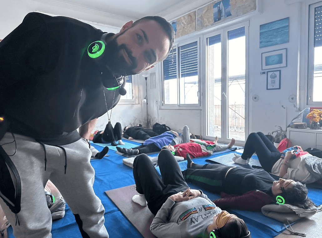 Utilizziamo una tecnica speciale di respirazione psicosomatica con la bocca. Il suono 9D si muove in 9 dimensioni attorno a te. La musica ti accompagna. All'inizio senti il corpo rispondere: calore, formicolii, emozioni che si muovono. È normale — è il tuo sistema nervoso che si sta scaricando. La tensione comincia a sciogliersi da sola.